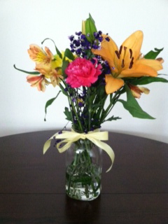 “Celebrating home,” I said, and then I filled the jar with water, arranged the flowers, attached the ribbon, and took a picture.